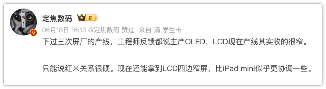 6月18日,知名博主数码变焦发帖称:“下过三次屏厂的产线,工程师反馈主产OLED、LCD的产线现在其实收的很窄。只能说红米关系很硬。现在还能拿到LCD四边窄屏,比iPad mini似乎更协调一些。”