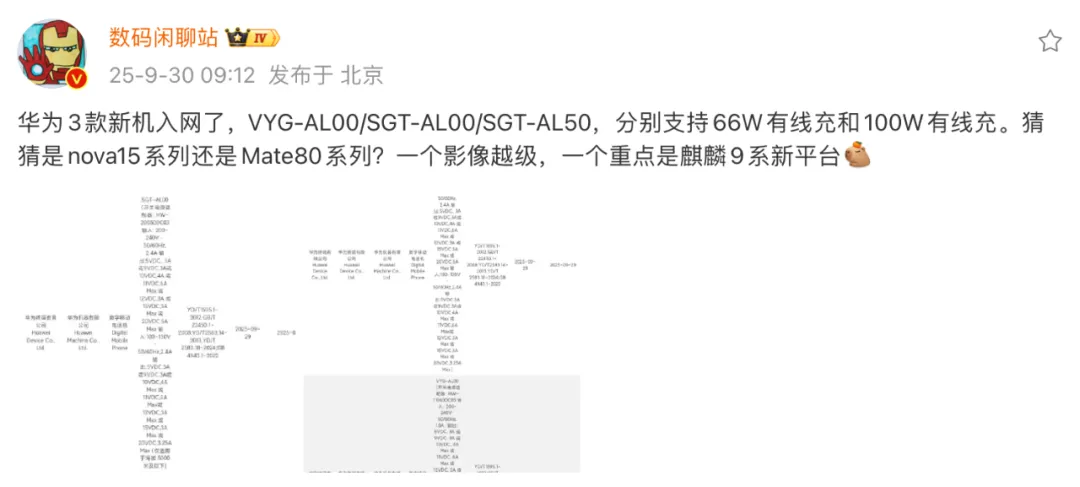 根据博主@数码闲聊站 最新爆料显示,华为旗下设备型号为VYG-AL00、SGT-AL00和SGT-AL50的三款新机通过了工信部认证,分别支持66W有线快充和100W有线快充。同时,该博主提示新机可能是nova15系列,或者Mate80系列。