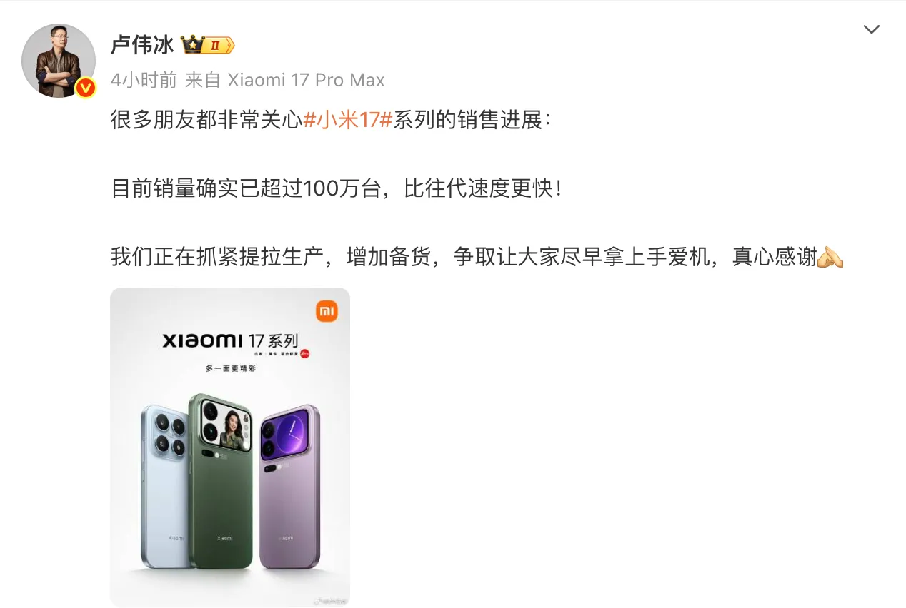 刚刚,小米集团合伙人、小米品牌总经理@卢伟冰 在微博发文称,小米 17 系列目前销量已超过 100 万台,比前代速度更快。