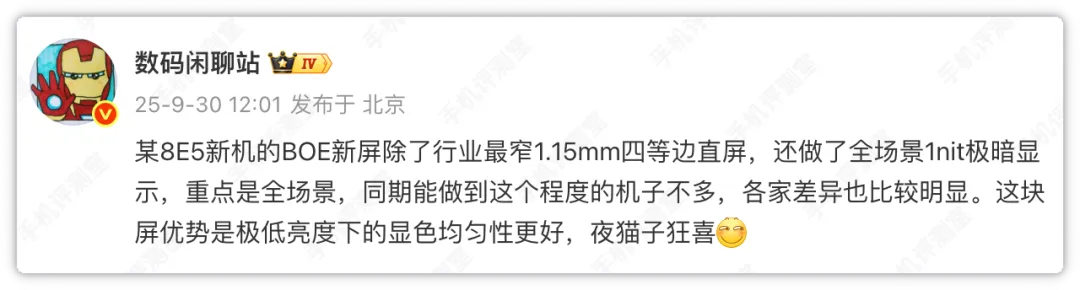 9月30日,数码闲聊站发帖称:“某8E5新机的京东方新屏除了行业最窄1.15毫米四等边直屏,还做了全场景1nit极暗显示,重点是全场景,同期能做到这个程度的机子不多,各家差异也比较明显。这块屏优势是极低亮度下的显色均匀性更好,夜猫子狂喜!”
