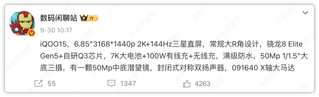 9月30日,数码闲聊站把iQOO 15的核心参数全撂了出来。趁着假期闲着没事,本期咱们就结合站哥的爆料和官方预热,彻底盘点一下iQOO 15的配置。