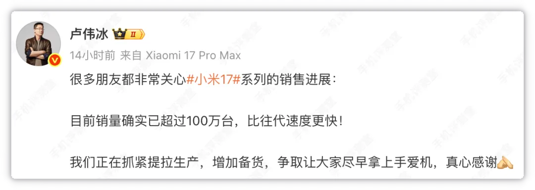 小米官方估计也憋不住了。10月2日,小米集团合伙人、总裁卢伟冰亲自发帖:“很多朋友都非常关心小米17系列的销售进展,目前销量确实已超过100万台,比往代速度更快!我们正在抓紧提拉生产,增加备货,争取让大家尽早拿上手爱机,真心感谢!”