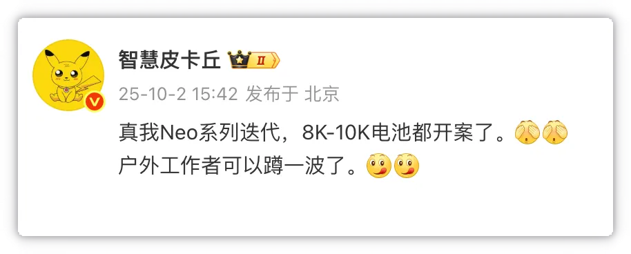 10月2日,知名博主智慧皮卡丘发帖称:“真我Neo系列迭代,8K-10K电池都开案了,户外工作者可以蹲一波。”