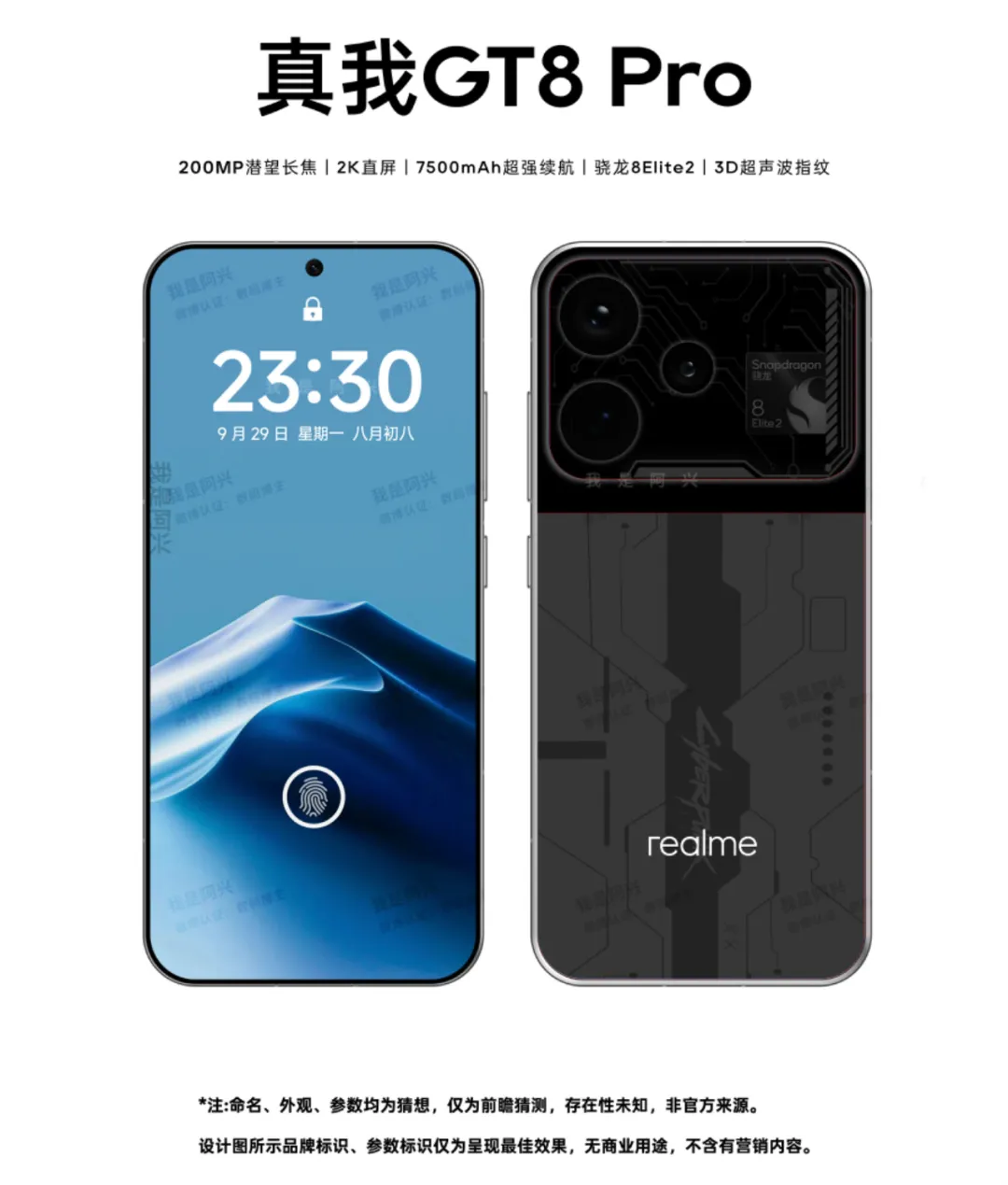 屏幕方面,真我GT8 Pro或将配备2K分辨率直屏,与前代的等深微曲屏不同,这种直屏方案更适合电竞玩家和直屏党用户。同时影像也会有全新升级,有望配备全新大底主摄+2亿像素大底潜望长焦镜头,在长焦成像、细节解析以及夜景表现方面都会大幅跃升。(下图为网友新机猜想图)