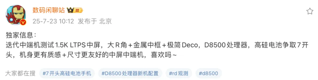 根据博主@数码闲聊站 近日爆料暗示,REDMI Turbo5系列工程机正在测试一块1.5K LTPS中屏,机身采用大R角+金属中框+极简DECO,搭载天玑8500处理器,高硅电池争取7开头,将是一款机身更有质感+尺寸更友好的中屏中端机。