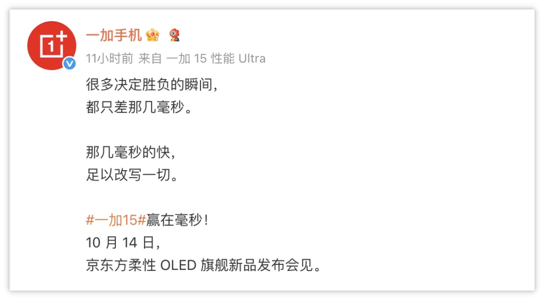 10月12日,一加突然在社交平台官宣14号开发布会,我当时脑子一热就把“一加15官宣:10月14日新品降临!”标题敲出来了,结果一看海报,竟然是京东方柔性OLED旗舰新品发布会!