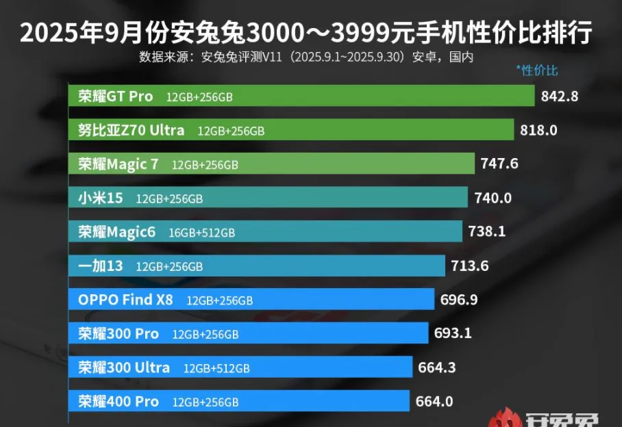 荣耀GTPro这款手机一开始定价三四千档价位上,自4月份上市以来,在安兔兔3000代3999元价位上,多次拿下性价比第1名,这不在最新的性价比排行榜中,也是再次拿下排名第1名了,这款手机堪称荣耀性能旗舰“卷王”,非常适合注重性能,续航以及游戏体验的用户入手。