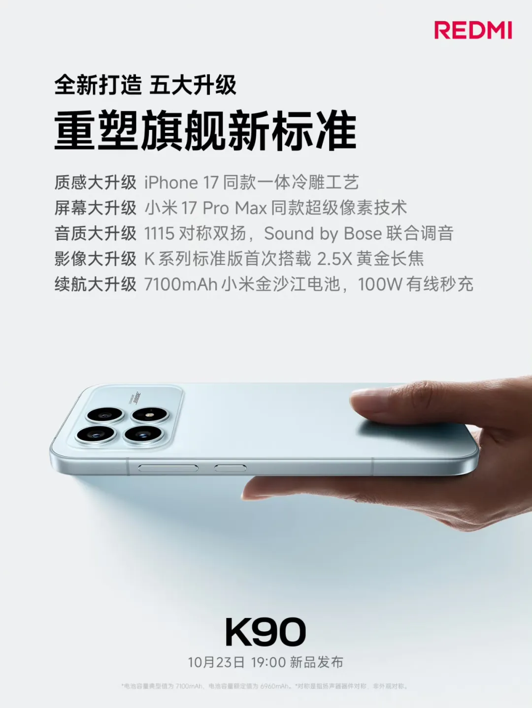 根据官方公布的信息,K90标准版将带来五大升级亮点:质感(iPhone17同款一体冷雕工艺)、屏幕(与小米17ProMax 同款超级像素排列)、音质(1115对称单元 + Sound by Bose)、影像(K系标准版首次配2.5X黄金长焦)、续航(7100mAh+100W秒充)。这五大升级与日常使用关联密切,意味着用户体验会有明显提升。
