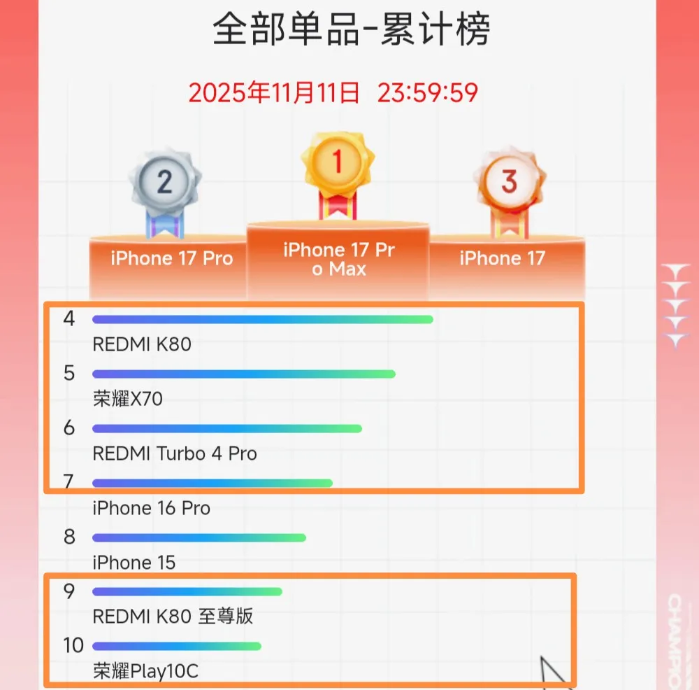 果然,高端看苹果,低端选红米!本次双十一活动销量最好的 10 款手机当做,也仅有荣耀两款低端机型入选,其它友商机型愣是一款没有!有点意外的是,红米K80 和 iPhone16 Pro两款新机依旧能上榜,并且还拥有很不错的成绩。