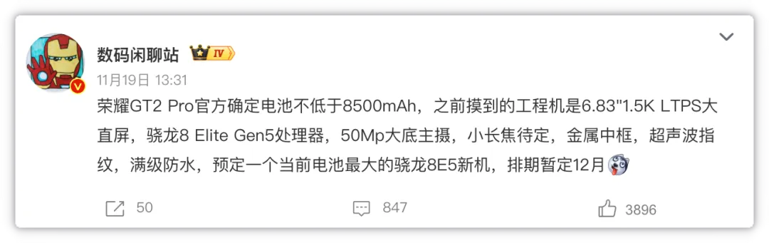 性能是GT系列的强项,新机将搭载第五代骁龙8至尊版芯片和8500mAh大电池,并配备LPDDR5X内存和UFS 4.1闪存,支持100W有线闪充。